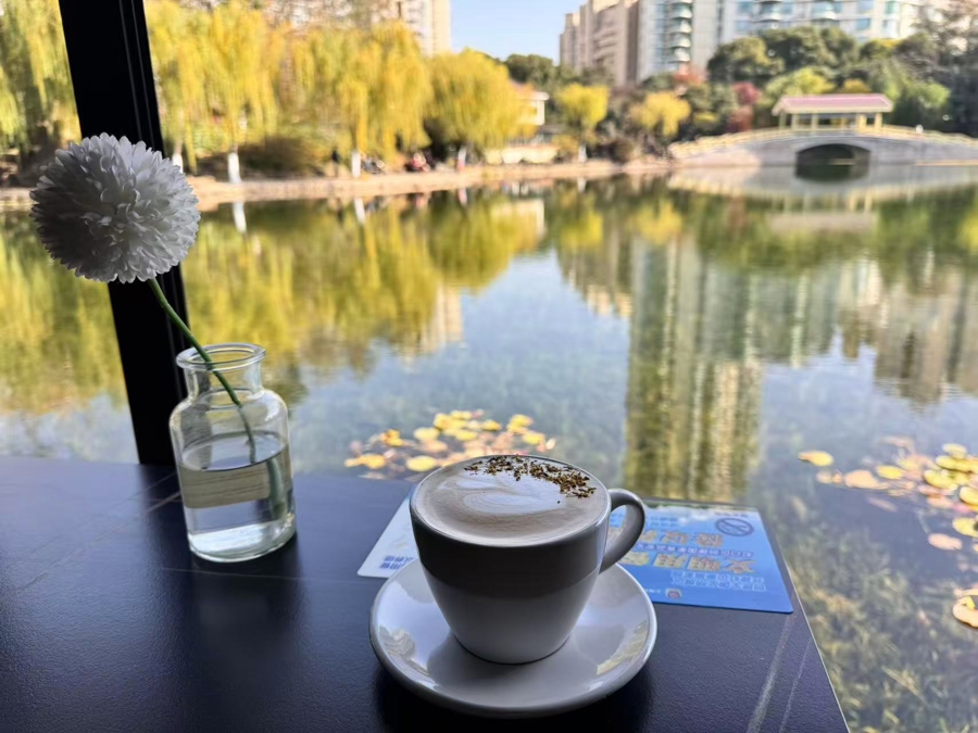 临湖而建的涟咖啡,推出94岁老太太也爱喝的季节限定桂花拿铁。 文汇报记者 单颖文