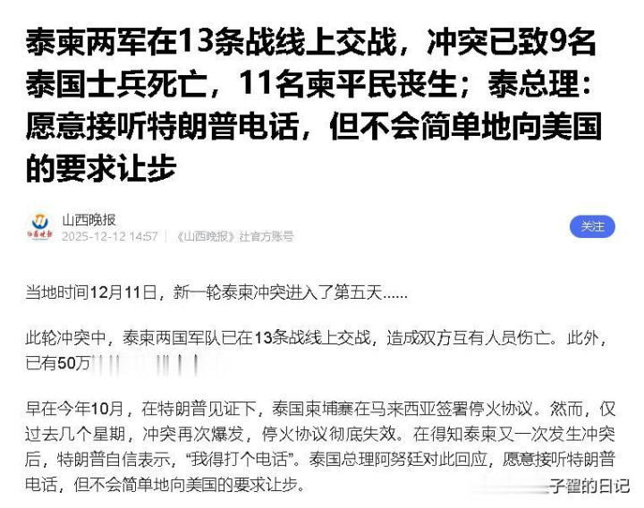 可谁也没想到,这份停火协议只维持了几个星期,就因为泰国士兵疑似遭柬埔寨地雷炸伤而失效,如今冲突再起特朗普的“调停神话”彻底破灭。